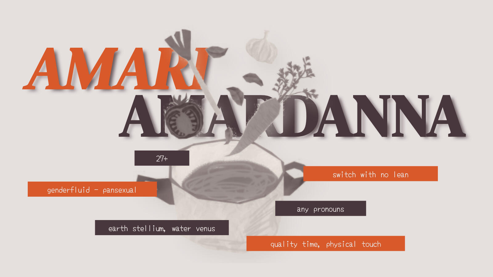 Have you ever craved a bowl of warm soup without any clear reason? Maybe it is a cold day, maybe it is raining, maybe, you just do not realize that you have been starving for comfort. And that is exactly how Amari’s presence will make you feel. They make you want to sit down and drown yourself in that cozy, toasty feeling for some good while. Sharing a conversation or two during that moment will not be that bad, no? Amari will ensure that the pace does not rush you in any way. Stay calm and sit still, give yourself a moment to settle. Enjoy the first bite of your soup and let yourself get washed up by the feeling of being safe and cared for.Care does not come as something that overwhelms you with Amari around. It comes in small, steady moments. Amari carries it within their little quirks, the way a good soup has its own unexpected ingredients. You might catch it in the way Amari laughs at their own silly jokes, or how Amari always notices the small things everyone else misses. In times when Amari catches your hand trembling, they will hold it gently and cup it in theirs until it stops, for as long as you need. In a heartbeat, you catch yourself smiling, right after you get a taste of everything you savored. Surprising yet familiar. It slips in quietly, the way Amari always does. Nothing too over the top, just the amount of richness that feels right.A good broth does not rush. It simmers slowly, letting every flavor deepen and settle into something beyond people’s taste-buds. Amari is the same. They take time in peeling your layers, tastefully poking at every little moment. Letting echoed laughs, exchanged glances, lingering touches, and stolen kisses turn into precious moments. Being with Amari feels like watching a soup slowly come to life. You learn to notice little things, the hidden spices, all the seconds that are perfectly seasoned and make you feel content. Not full, content.Amari is more than a bowl of soup, they are a mischievous little pot of spices, each one adding its own pinch of charm. The more time you spend with Amari, the more you realize how their warmth lingers, the same way a warm bowl of soup stays with you and keeps you grounded. With Amari, nothing is wasted, as they make every little bit of time count. Turning it into a comforting yet flavorful experience you cannot help but savor.