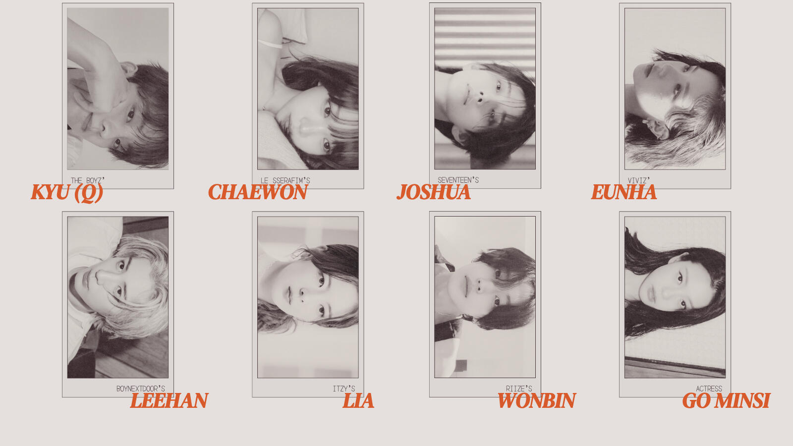 Kim Yeri. Choi Yeonjun. Minatozaki Sana. Jung Wooyoung. Kim Chungha. Zhang Hao. Miyawaki Sakura.